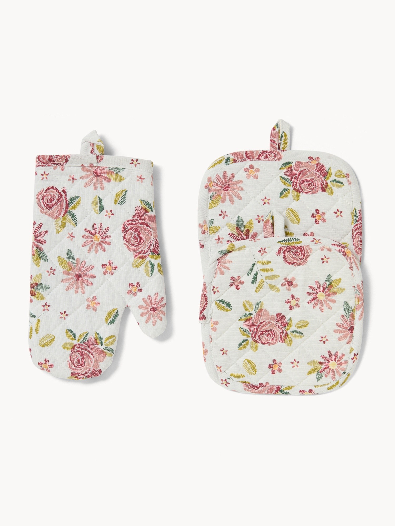 Set guanto cucina e 2 presine in panama di cotone con stampa roselline - Prezzo di lancio