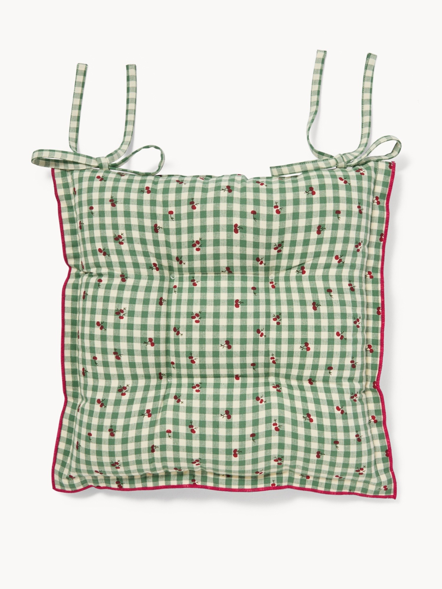 Cuscino da sedia in puro cotone tinto filo vichy con stampa ciliegie e piping - Prezzo di lancio