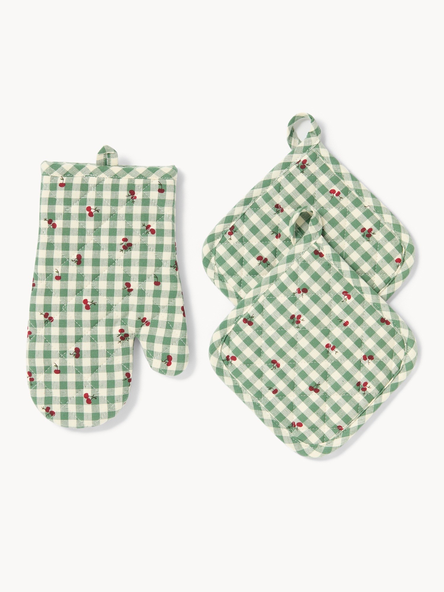 Set guanto da cucina e due presine in puro cotone tinto filo vichy con stampa ciliegie - Prezzo di lancio