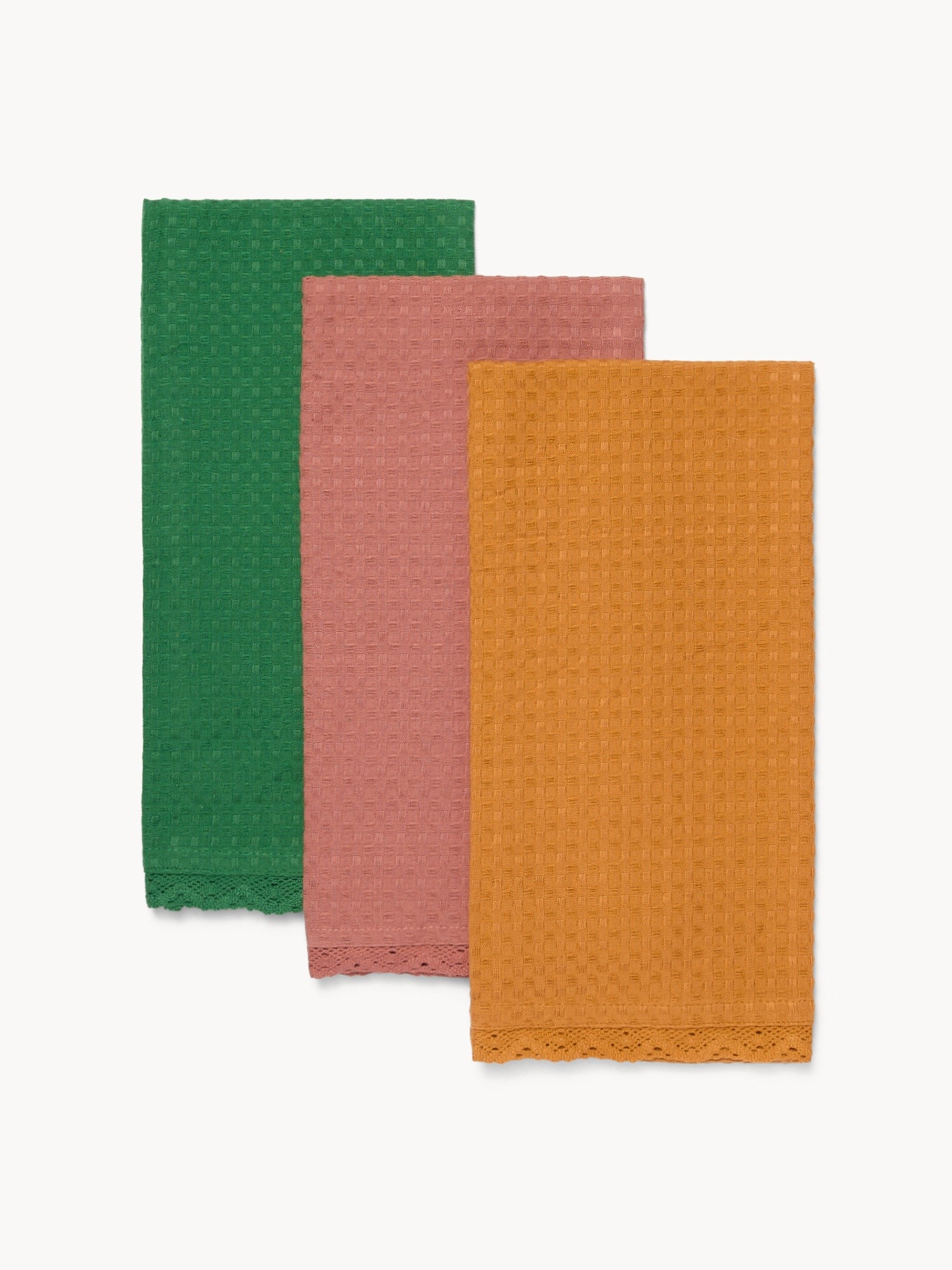 Set di 3 strofinacci in puro cotone con trama a nido d'ape e applicazione pizzo - Prezzo di lancio